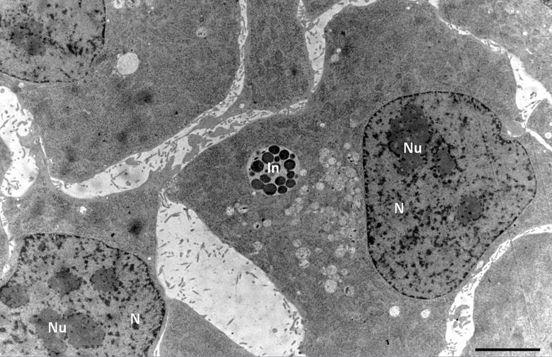 Hình 7: Ảnh lát cắt của tế bào Hep-2 nhiễm vi rút viêm phổi. N, nhân tế bào; Nu, hạch nhân; In, thể vùi. Thang đo 5 µm