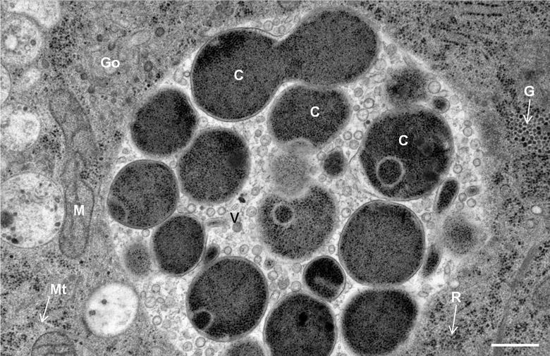 Hình 8: Độ phóng đại cao hơn cho thể vùi của tế bào trong Hình 1. C, tế bào virút viêm phổi; G, Hạt Glycogen; Go, Golgi; M, Mitochondrium; Mt, vi cấu trúc hình ống; R, ribô thể; V, bọng nước. Thang đo 50 nm