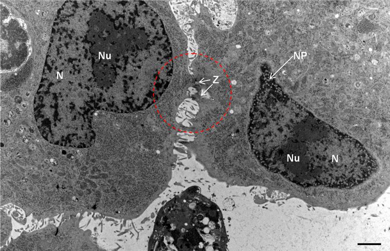 Hình 9: Ảnh lát mỏng tế bào Hep-2 nhiễm vi rút viêm phổi. N, nhân tế bào; Nu, hạch nhân; NP, Nucleopores; Z, Zonula adhaerens. Thước đo 2 µm.