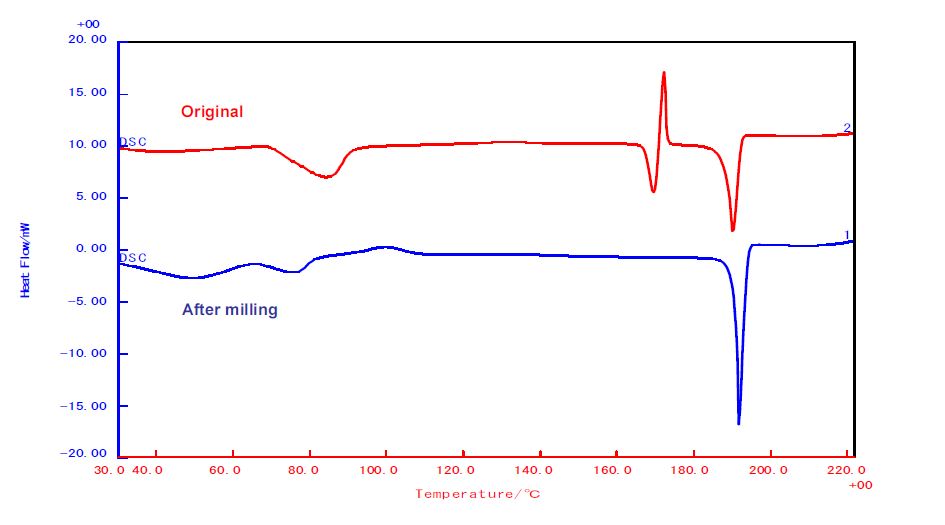Đồ thị trên là một ví dụ về kết quả đo DSC so sánh mẫu dược phẩm không nghiền (nguyên bản) và mẫu dược phẩm nghiền (dạng bột). Trong kết quả đo DSC của nguyên liệu nguyên bản hoặc không bị nghiền, đỉnh hấp thụ nhiệt do nóng chảy và đỉnh tỏa nhiệt do tái kết tinh liên tục xảy ra ở 160oC, và sau đó một đỉnh hấp thụ nhiệt do nóng chảy ở 180oC. Ngược lại, phản ứng tỏa nhiệt ở 160oC không được quan sát thấy trong mẫu được nghiền và chỉ tìm thấy đỉnh hấp thụ nhiệt do nóng chảy ở 180oC. Cả hai kết quả đo cũng cho thấy sự khác biệt về đỉnh hấp thụ nhiệt gây ra do mất nước gần nhiệt độ phòng. Tác động cơ học bên ngoài trên mẫu tạo ra những thay đổi vật lý (hiệu ứng hóa-cơ) có thể gây ra sự khác biệt trong kết quả đo.