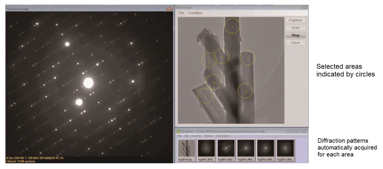 Hình 10 đưa ra ví dụ về sự thu nhận tự động hình ảnh hiễu xạ điện tử lựa chọn vùng (SAD) sử dụng chức năng phân tích Nano, trong trường hợp này là mẫu amiăng. Trong ảnh TEM, 10 vùng được đánh dầu bằng các đường tròn tương ứng với đường kính khẩu độ được chọn. Bằng cách thu nhận nhiễu xạ điện tử lựa chọn vùng tự động, trường nhìn và hình ảnh nhiễu xạ tương ứng được lưu lại cho từng vùng được chọn.