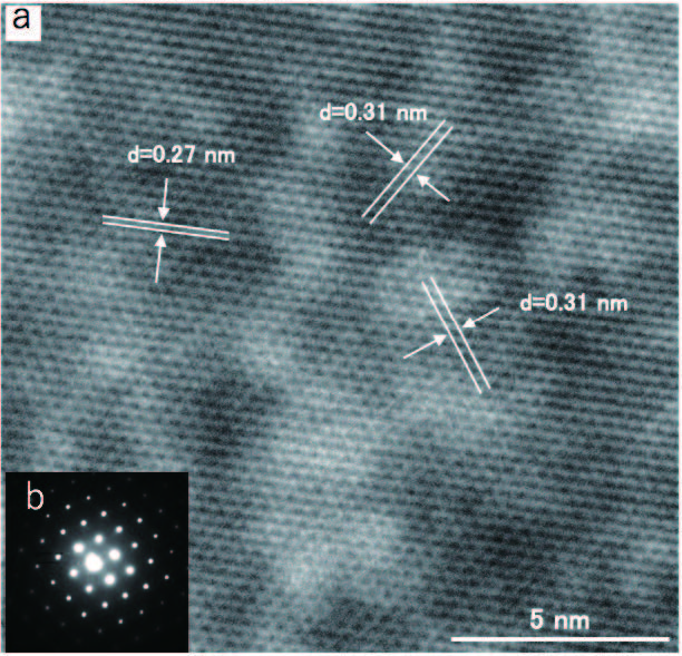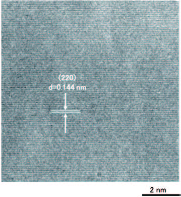 Hình 6 là hình ảnh độ phân giải cao của đơn tinh thể Silicon (Si) [Hình 6 (a)] và hình ảnh nhiễu xạ tương ứng [Hình 6(b)]. Hình ảnh mạng tinh thể được nhìn rõ theo ba chiều, chức năng này rất hữu ích cho việc hiệu chỉnh phép đo kích thước trong các thiết bị bán dẫn Si. Hình 7 là hình ảnh phân giải cao của hạt nano TiO2, trong đó mạng tinh thể có kích thước 0.35 nm được quan sát một cách rõ nét.