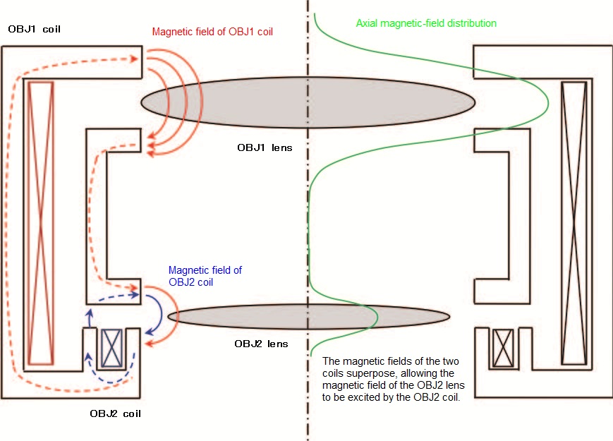 HT7820 được trang bị các vật kính Dual-Mode riêng biệt của Hitachi, nó cho phép chuyển đổi giữa chế độ tương phản cao (HC) và chế độ phân giải cao (HR) phụ thuộc vào mục đích của việc quan sát. Như minh họa ở sơ đồ nguyên lý hình 3, vật kính 2 OBJ2 (góc thấp) có thể được bật hoặc tắt bằng cách chuyển đổi cực tính của cuộn dây, cho phép thu được cả tiêu cự dài (chế độ HC) và ngắn (chế độ HR) bằng môt thấu kính đơn. Ưu điểm của thiết kệ này là việc chuyển đổi chế độ HC và HR chỉ cần yêu cầu chuyển đổi cực tính của cuộn dây.