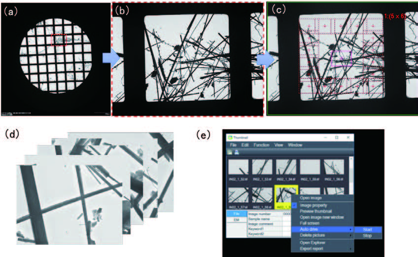 Hình 9 minh họa chức năng điều hướng hình ảnh để thu nhận hình ảnh tự động. Mẫu là các amiăng. Đầu tiên, chế độ xem lưới được hiển thi trên màn hình navigation bằng một lần 1 lần nhấp chuột [Hình 9 (a)]. Sau đó, khu vực cần quan sát được chọn, hình ảnh ở khu vực được chọn (b) ở độ phóng đại mong muốn (c) sẽ được chụp tự động (d). Các hình ảnh được chụp tự động sẽ được lưu trữ trong dữ liệu cùng với thông tin hình ảnh và được hiển thi trong chế độ xem màn hình thu nhỏ. Khi người dùng click chuột vào bất cứ hình ảnh nào trong chế độ Thumbnail và chọn chức năng “Auto drive”, phần mềm sẽ di chuyển đế đến vị trí ảnh đã chụp (e).