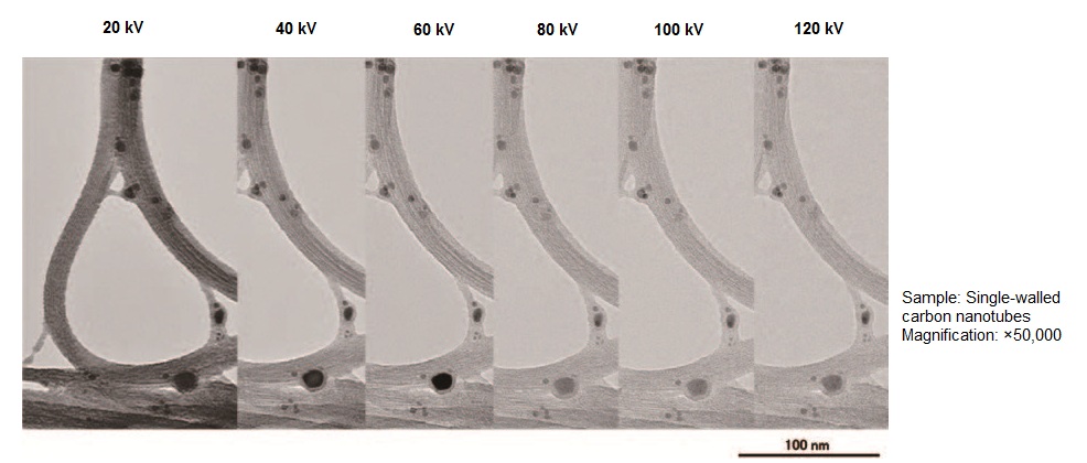 Hình 8 là hình ảnh một ống nano carbon đơn vách được quan sát ở dãy thế gia tốc từ 20 kV đến 120 kV với các bước là 20 kV. Việc sử dụng thế gia tốc thấp hơn cho phép phân biệt rõ từng ống nano cacbon với độ tương phản cao hơn.