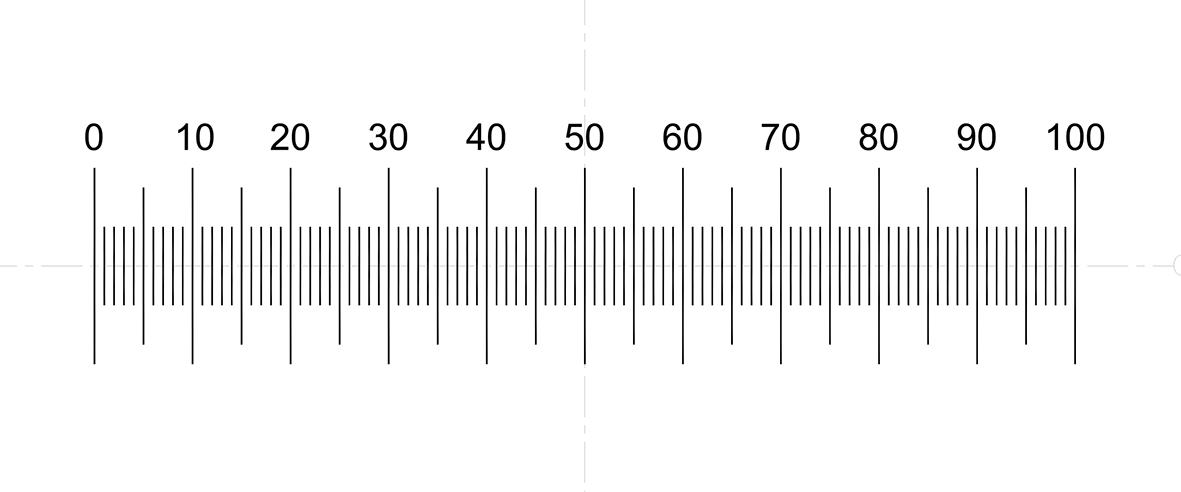 Trắc vi thị kính với thước chia vạch nằm ngang dài 0.1 inch, 100 vạch chia x 0.001inch. Khi được sử dụng với 1 vật kính x10 mỗi vạch chia sẽ tương ứng 0.0001" (0.1 thou) trên mẫu vật. Bằng cách lấy giá trị mỗi vạch chia của thước trắc vi chia cho độ phóng đại của vật kính, kết quả tìm được chính là giá trị mỗi vạch chia hiển thị trên bàn soi.