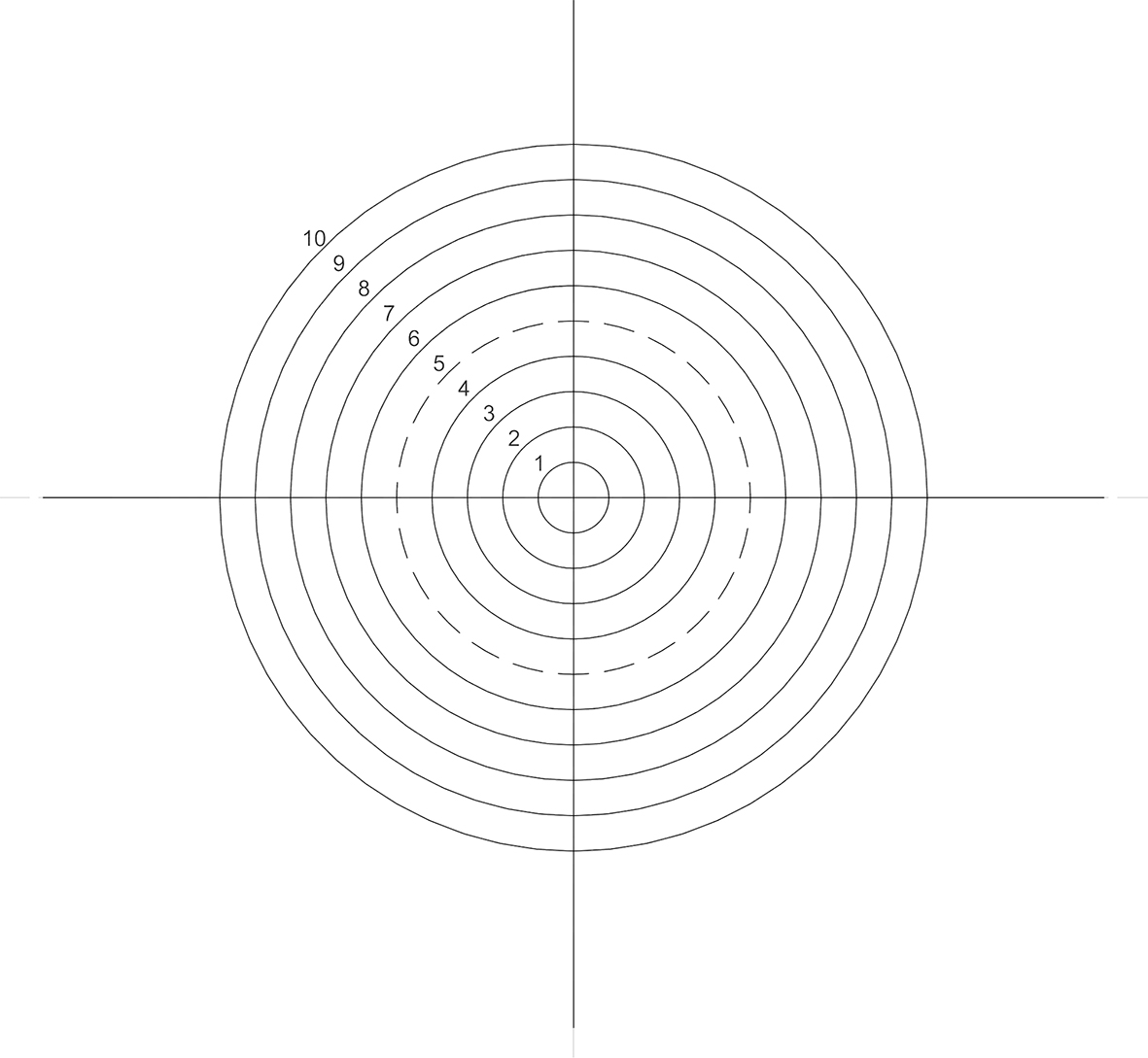 Các đường tròn đồng tâm, đường kính từ .25mm tới 2.5mm, cách nhau 0.25mm; 10 đường tròn lần lượt được đánh số, đường tròn thứ 5 có nét đứt.