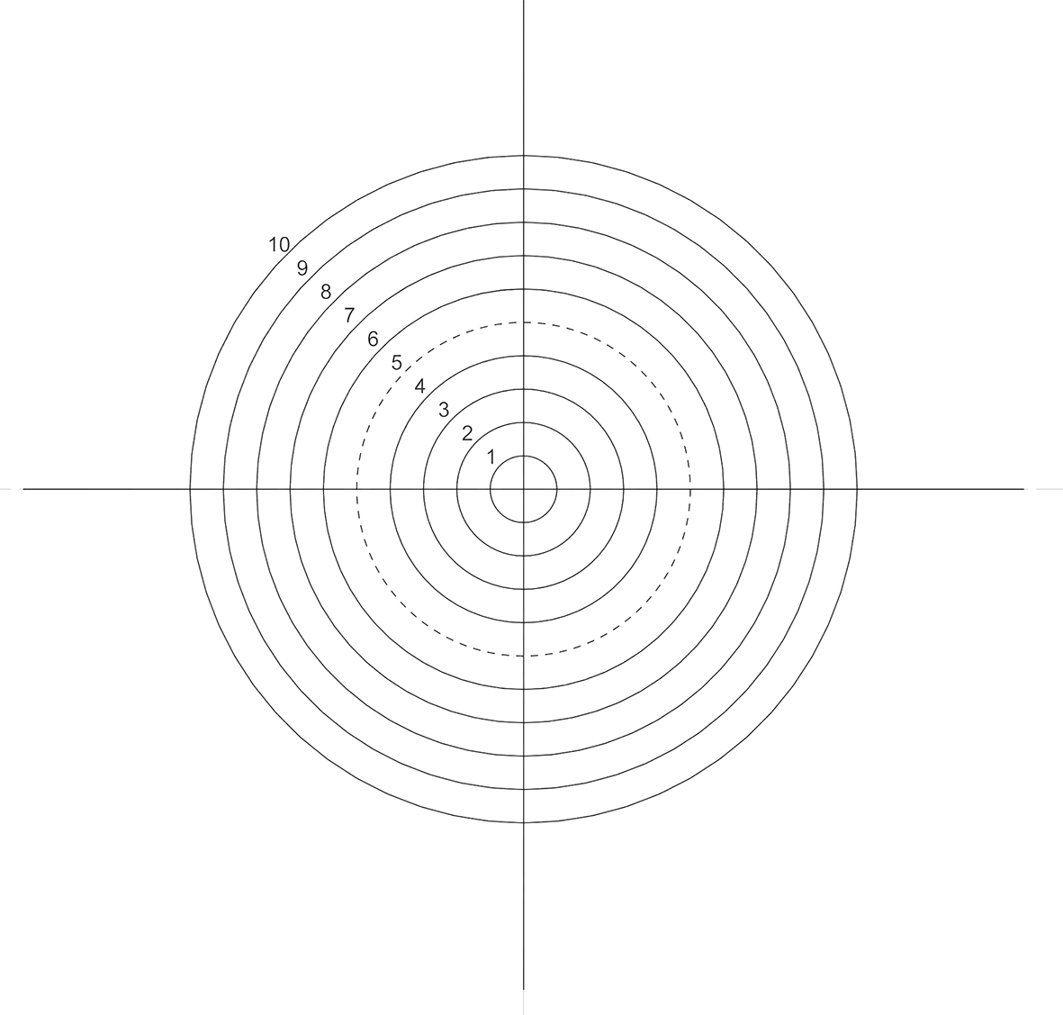 Các đường tròn đồng tâm, đường kính từ 0.5mm tới 5mm, cách nhau 0.5mm; 10 đường tròn lần lượt được đánh số, đường tròn thứ 5 có nét đứt.