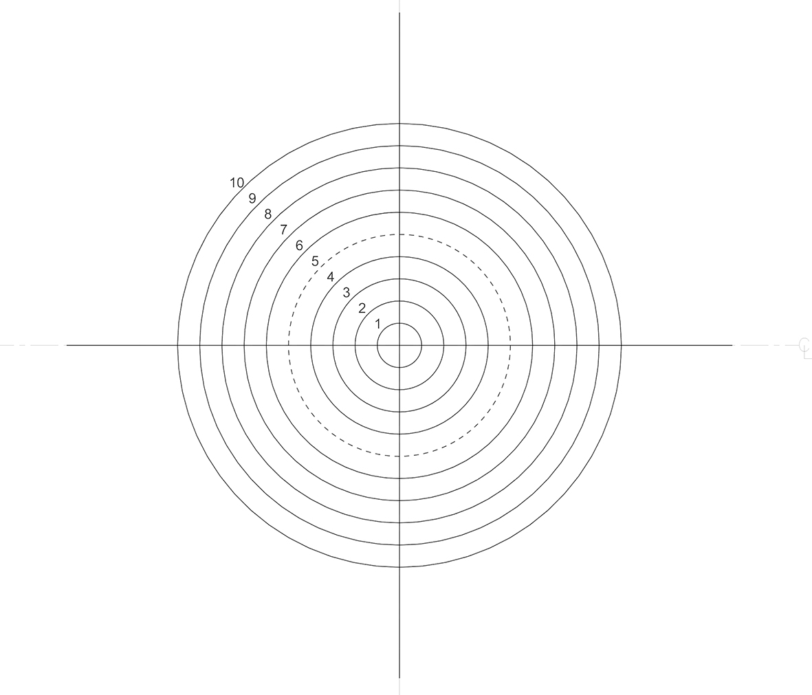 Các đường tròn đồng tâm, đường kính từ 1mm tới 10mm, cách nhau 1mm; 10 đường tròn lần lượt được đánh số, đường tròn thứ 5 có nét đứt.
