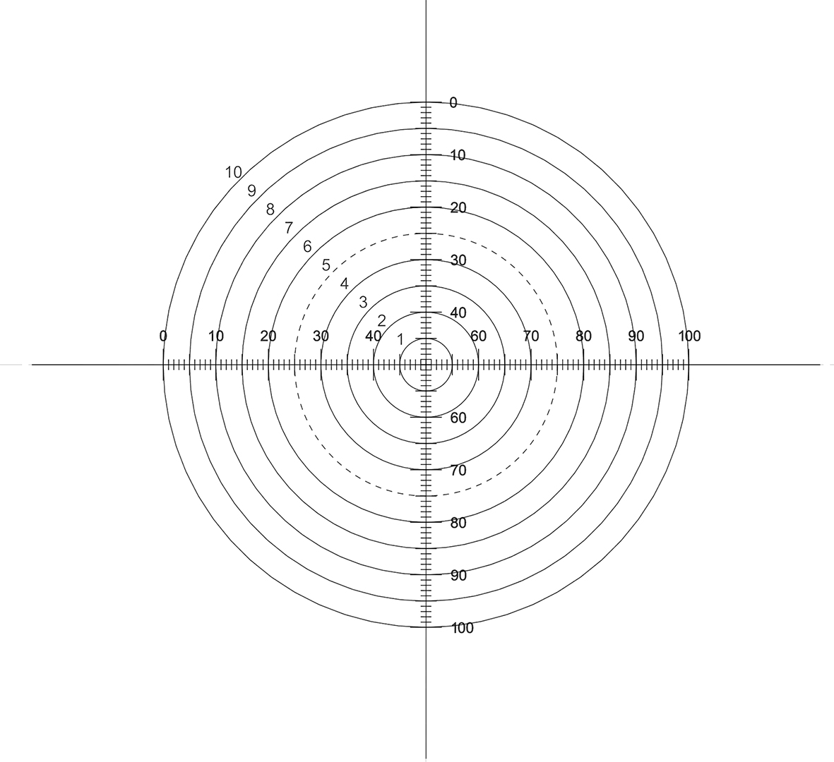 Các đường tròn đồng tâm, đường kính từ 1.0 - 10mm và cách nhau 1mm, 10 đường tròn lần lượt được đánh số, đường tròn thứ 5 là nét đứt. Thước chia vạch hình chữ thập 10mm vạch chia tăng dần từ 0 - 100.