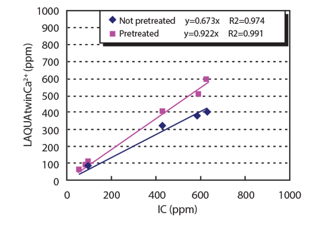 Biểu đồ 1 thể hiện sự tương quan giữa dữ liệu thu được từ bút đo LAQUAtwin Ca2+ và phương pháp sắc ký ion đối với dung dịch mẫu đã được xử lý và chưa được xử lý trước khi đo.