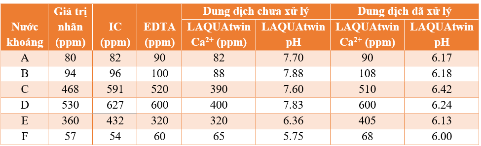 Có thể thấy nước khoáng giàu Canxi sẽ chứa canxi sunfat (CaSO4) và canxi cacbonat (CaCO3) (CaSO4 và CaCO3 đã bị ion hóa trong quá trình xử lý dung dịch mẫu trước đó). Bảng số liệu cũng cho thấy bút đo LAQUAtwin đo hàm lượng Canxi chính xác hơn so với các phương pháp khác đối với mẫu dung dịch được xử lý trước khi thí nghiệm.