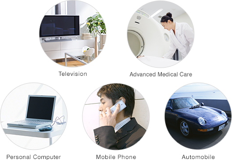 Ví dụ, cảm biến nhiệt độ được trong điều hòa không khí được làm từ chất bán dẫn. Nồi cơm điện có thể nấu cơm một cách hoàn hảo là nhờ hệ thống điều khiển nhiệt độ chính xác có sử dụng chất bán dẫn. Bộ vi xử lý của máy tính CPU cũng được làm từ các nguyên liệu chất bán dẫn. Nhiều sản phẩm tiêu dùng kỹ thuật số như điện thoại di động, máy ảnh, TV, máy giặt, tủ lạnh và bóng đèn LED cũng sử dụng chất bán dẫn.
