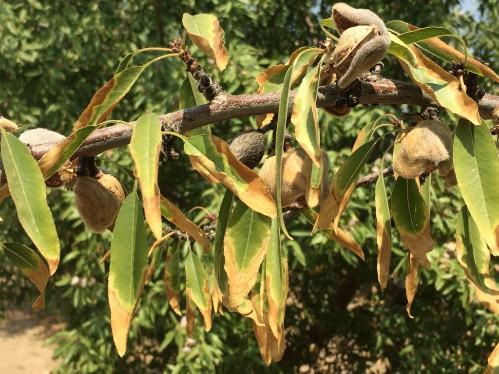 Hình 2: Bệnh cháy lá trong vườn cây hạnh nhân; Nguồn: Rosenzweig, B. (2016). Quản lí độ mặn của đất