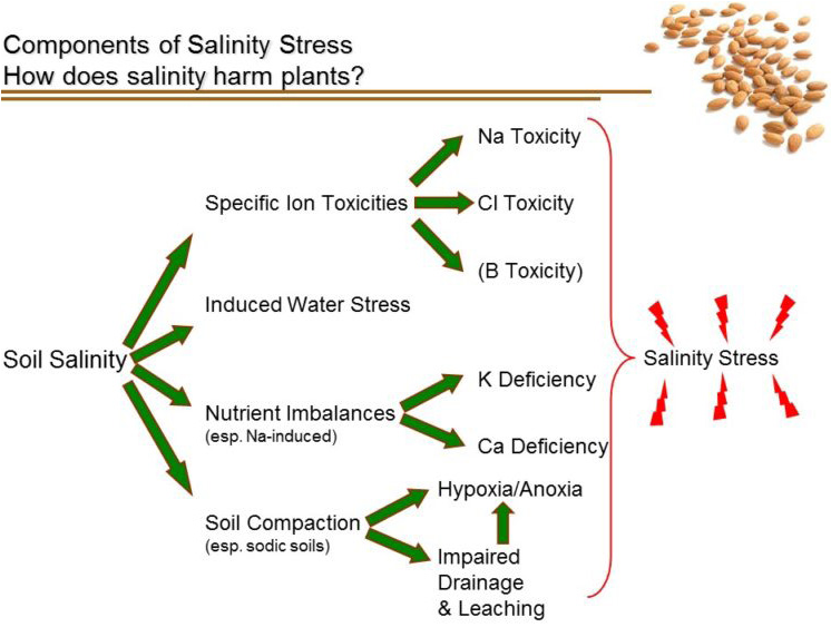 Hàm lượng muối cao có thể làm cho đất bị nhiễm mặn đồng thời hạn chế sự phát triển đối với các loại thực vật dễ chịu tác động bởi nồng độ muối. Trong số các yếu tố có thể gây ra tình trạng trên (xem Hình 1), các độc chất như natri (Na), clorua (Cl) và boron (B), là những ion phổ biến nhất có thể làm tổn thương các mô lá cây. Trong vườn cây ăn quả, ví dụ điển hình và rất thường gặp của tình trạng ngộ độc mặn trên các cây trồng là bệnh "cháy lá" (xem hình 2) và cách tốt nhất để ngăn ngừa là theo dõi một cách chặt chẽ độ mặn của đất. Ưu điểm của công tác giám sát độ mặn đất là chúng ta có thể thực thi các biện pháp khắc phục cần thiết và kịp thời trước khi các triệu chứng bệnh bắt đầu xuất hiện trên mô lá. Việc kiểm tra mẫu đất hàng năm từ các địa điểm được lựa chọn trong vườn cây nên là một phần của chương trình quản lý của mỗi một người canh tác.