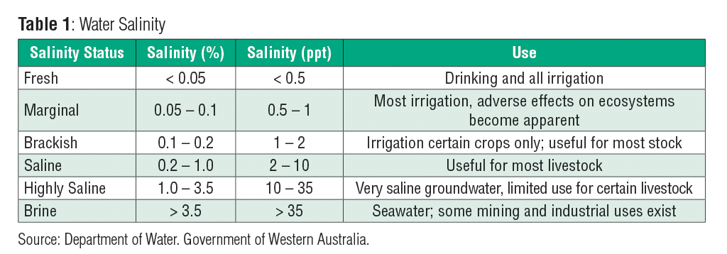 Bảng dưới đây cho thấy các giá trị độ mặn theo loại nước và mục đích sử dụng.