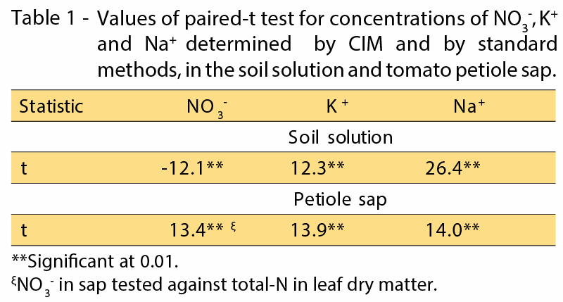 Kết quả đo hàm lượng NO3-, K+, và Na+ trong nhành cây bằng bút đo ion Cardy có sự tương quan chặt chẽ và hợp lý với các thông số tương ứng trong lá cây đã sấy khô và tỷ đối đáng kể giữa ion (bảng 1). Hệ số r2 của hàm lượng dinh dưỡng trong nhựa cây ở nhành lá và trong lá cây khô gần bằng với các kết quả được công bố bởi nhiều nghiên cứu khác. Kết quả so sánh hàm lượng ion Na+ trong nhựa cây ở nhành lá và lá khô không được tìm thấy trong các tài liệu có sẵn.