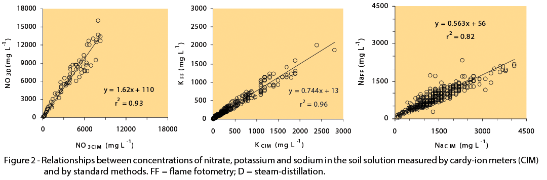 Hàm lượng các ion NO3-, K+, và Na+ trong dung dịch đất được xác định bằng các bút đo ion Cardy và theo các phương pháp tiêu chuẩn trong phòng thí nghiệm có mối tương quan chặt chẽ với nhau (xem hình 2). Hàm lượng NO3- được xác định bằng bút đo ion Cardy thấp hơn khoảng 39% so với kết quả tương ứng được xác định bằng phương pháp chưng cất, trong khi đó hàm lượng các ion K+ và Na+ lần lượt cao hơn 21% và 67%, so với các kết quả tương ứng khi sử dụng phương pháp trắc quang ngọn lửa. Hệ số xác định (r2) của tất cả ion đều cao hơn và tỷ đối giữa chúng là 1% (bảng 1).
