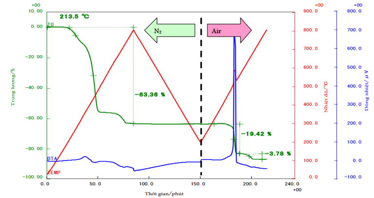 Đầu tiên, mẫu được đốt nóng đến nhiệt độ 800 độ C trong môi trường khí Ni-tơ để gây ra sự giảm cấp của các thành phần nhựa trong cao su. Trên đồ thị nhiệt trọng lượng TG, ở nhiệt độ 214 độ C có thể quan sát thấy hiện tượng giảm trọng lượng theo 3 giai đoạn do sự giảm cấp của thành phần nhựa. Khi đạt đến 800 độ C, nhiệt độ được giảm xuống còn 200 độ C và môi trường được chuyển sang môi trường không khí. Cuối cùng, người ta lại tăng nhiệt độ để làm cháy thành phần cacbon trong cao su. Đồ thị trên thể hiện hai giai đoạn giảm trọng lượng do sự cháy gây ra. Sự giảm trọng lượng ở vùng nhiệt độ thấp là do các thành phần bị cacbon hóa trong nhựa, trong khi sự giảm trọng lượng ở vùng nhiệt độ cao là do thành phần cacbon.