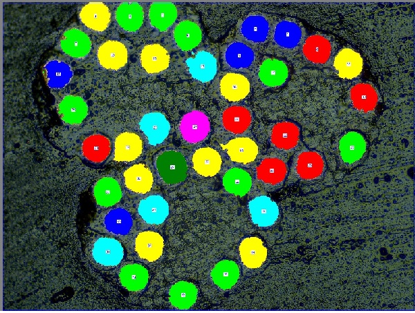 Sau quá trình chuẩn bị mẫu, có thể xác định được số lượng lõi đồng của cáp tai nghe theo tiết diện, các chi tiết được quan sát rõ nét. Các lõi đồng được đánh dấu và phân tích bằng phần mềm LAS Image Analysis như kết quả dưới đây:
