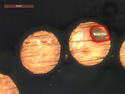 Ngoài ra, quan sát bằng kính hiển vi quang học Leica DM1750 M có thể phát hiện được khuyết tật trên mặt cắt ngang của lõi đồng. Bằng chức năng đo lường tương tác, có thể vẽ đường biên của điểm khuyết tật để xác định diện tích như ảnh dưới đây: